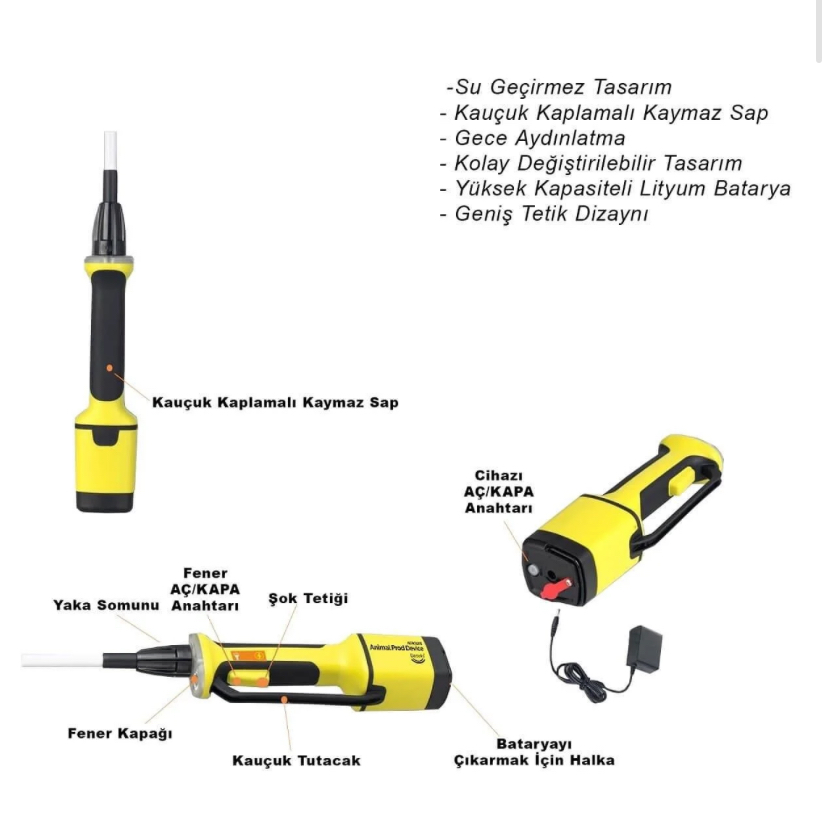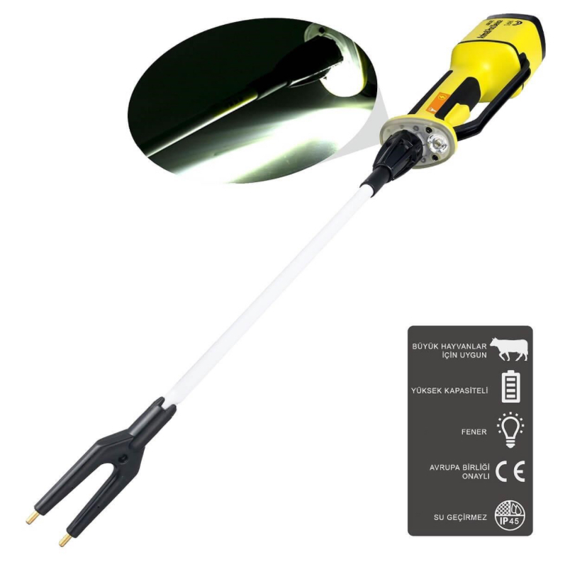 Öne Çıkan Özellikler • 9000 Volt güçlü şok: Hayvana zarar vermeden etkili yönlendirme • 5400 mAh batarya: Tek şarj ile yaklaşık 20 gün kullanım • Uzun sap (98 cm): Güvenli mesafeden çalışma • Su geçirmez gövde: Zorlu saha ve ahır koşullarına uygun • Kaymaz kauçuk sap: Güvenli ve rahat tutuş • LED fener: Gece ve düşük ışıkta kullanım imkanı • Ergonomik tasarım: Uzun süreli kullanımda yormaz • USB ile şarj: Araçta ve her ortamda kolay şarj