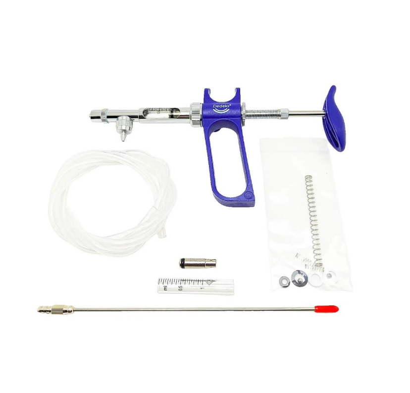 Metal pistonlu hortumlu otomatik şırınga, 1 ml hazneye sahiptir. Büyükbaş, küçükbaş ve özellikle kanatlı hayvanların aşılanmasında kullanılır ve uygulamada büyük kolaylık sağlar.