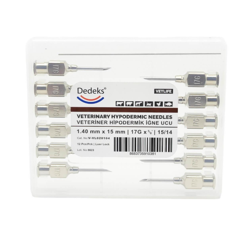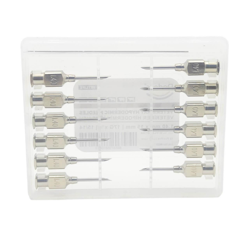 Çok kullanımlık veteriner iğne ucu, 1.40 mm x 15 mm ölçüsü ile genellikle küçükbaş hayvan aşılamalarında, deri altı ve kas içi enjeksiyon uygulamalarında tercih edilir. Balık, tavuk ve farklı ölçülerde enjektör iğne uçları da mağazamızda mevcuttur. ⸻ Ürün Özellikleri: • Paket İçeriği: 12’li paket • Malzeme: 1. kalite paslanmaz çelik • Sterilizasyon: Tüm sterilizasyon yöntemlerine uygundur • Uyumluluk: Luer-Lock sistemli mika ve otomatik enjektörlerle uyumlu ⸻ Not: Görsellerde yer alan ürün, temsili değil gerçek ürün boyutudur.