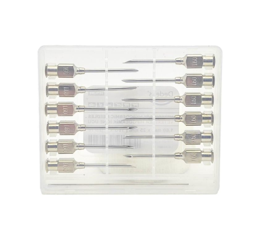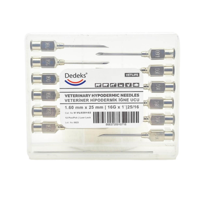Çok kullanımlık veteriner iğne ucu, 1.60 mm x 25 mm ölçüsü ile genellikle büyükbaş hayvanlarda enjeksiyon işlemlerinde, özellikle kas içi uygulamalarda tercih edilir. Balık, tavuk ve farklı ölçülerde enjektör iğne uçları da mağazamızda mevcuttur. ⸻ Ürün Özellikleri: • Paket İçeriği: 12’li paket • Malzeme: 1. kalite paslanmaz çelik • Sterilizasyon: Tüm sterilizasyon yöntemlerine uygundur • Uyumluluk: Luer-Lock sistemli mika ve otomatik enjektörlerle uyumlu